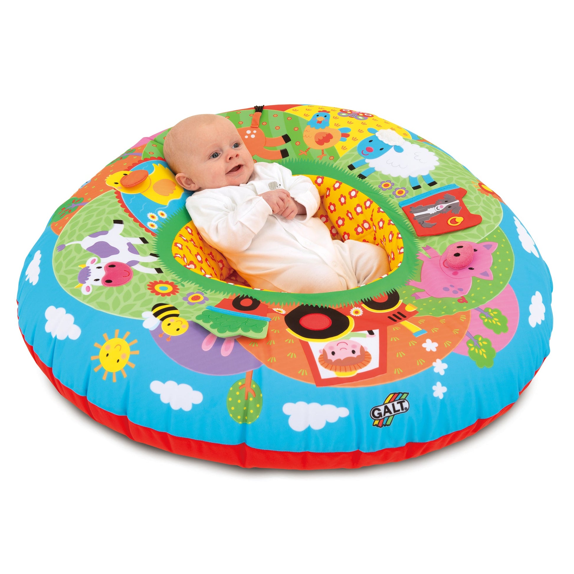 A soft multi-sensory environment with a fun farm scene around the Playnest® and the Gym as the sky above. Playnest® is a fabric covered inflatable ring that supports baby during play. There are textures and sounds to explore in the 4 Gym toys and the 8 activities around the Playnest® . Both hand/eye coordination and manipulative skills are encouraged and Playnest® & Gym will play an important role in baby's physical and play development. The Playnest®/Gym covers and soft toys are machine washable.