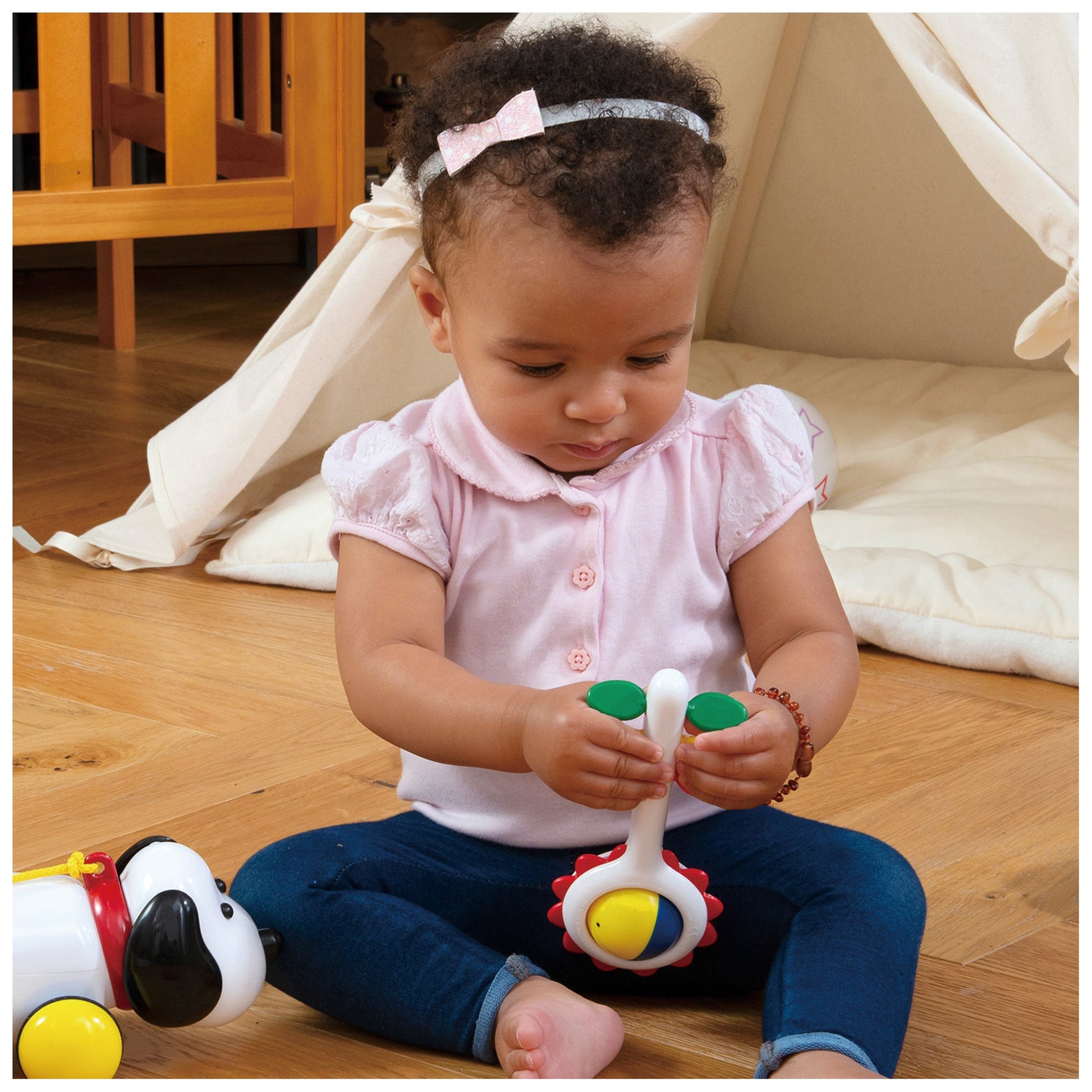 A cheery sunflower rattle to spin, shake, touch and turn. This 2-in-1 rattle can also be used as a teether. Height 17.3cm